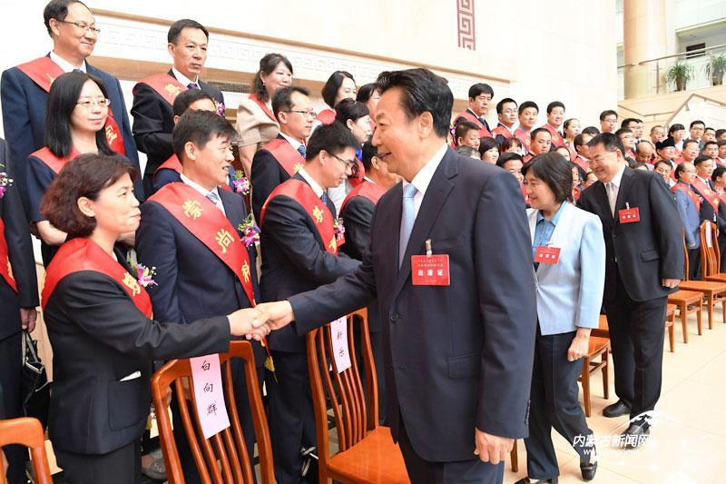 6月28日上午,自治区党委书记王君,自治区主席布小林,自治区政协主席任亚平在出席全区科技创新大会前亲切接见与会获奖代表。(袁永红 摄)