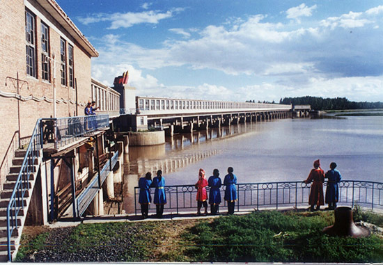 赤峰市翁牛特旗海日苏水利枢纽位于西拉木伦河中下游,工程1976年3月由翁牛特旗施工兴建。1978年8月竣工。先后有25个公社(场),6000名农牧民参加施工。主体工程由24孔拦河闸、左右岸3孔进水闸、1013米土坝,600千瓦水电站及公路桥组成,设计标准为百年一遇,洪水平面120米/秒,是一座以灌溉为主,兼有交通、发电、治沙等社会效益的水利枢纽工程,也是全区最大的牧区枢纽工程。