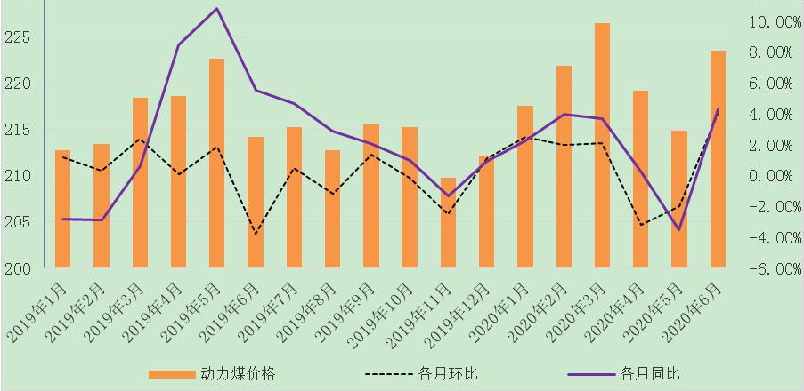 上半年全区动力煤平均坑口结算价格为220.57元/吨,较2019年下半年(下称环比)上涨3.34%,较2019年上半年(下称同比)上涨1.81%。1—6月,全区煤炭价格整体呈“涨降涨”的三段式“N”字型走势。第一阶段:1—3月,受新冠肺炎疫情影响,短期内供应紧张,煤炭价格上涨;第二阶段:4—5月,随着产出快速增加,但需求不及预期,价格连续回调;第三阶段:5月下旬开始,受进口减少、产地供应偏紧等因素共同影响,煤炭价格重拾上涨走势。