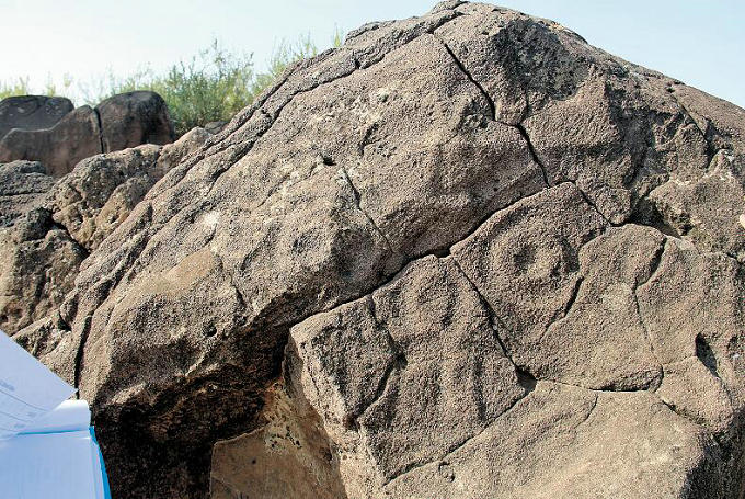吴甲才说,岩画中有一双对称的双环大眼,单只眼的直径约18厘米,两眼上方居中位置刻有“山”字形,两眼下方正中间刻有类似甲骨文的“祖”字形,再往下是椭圆形的口,口中刻有4个竖条。