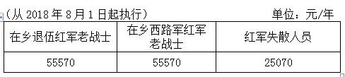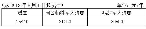 调整后,一级因战、因公、因病残疾军人(含伤残人民警察、伤残国家机关工作人员、伤残民兵民工)的残疾抚恤金标准每人每年分别为80140元、77610元、75060元;十级因战、因公残疾军人(含伤残人民警察、伤残国家机关工作人员、伤残民兵民工)的残疾抚恤金标准每人每年分别为8910元、7620元。烈属(含因公牺牲军人遗属、病故军人遗属)的定期抚恤金其中烈属每人每年25 440元,因公牺牲军人遗属每人每年21 850元,病故军人遗属每人每年20 550元。在乡退伍红军老战士的生活补助标准其中在乡退伍红军老战士每人每年55 570元,在乡西路军红军老战士每人每年55 570元,红军失散人员每人每年25 070元。