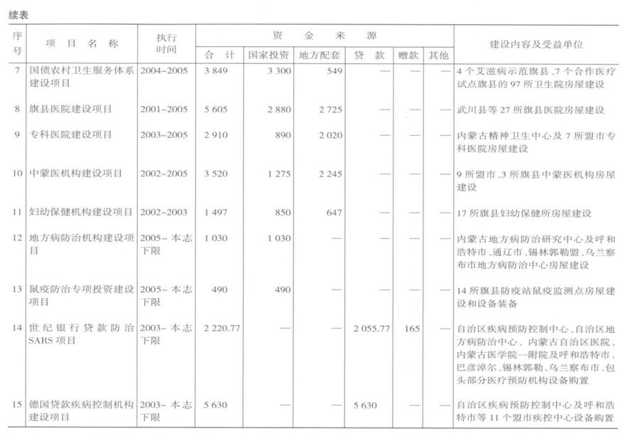 2003年,启动医疗救治体系建设项目,使自治区及11个盟市的急救中心、传染病医院和80个旗县医院的传染病区的基础建设上了一个新台阶;并对3个自治区级、17个盟市级非典定点医院和30个旗县发热门诊房屋、污水处理设施进行了改造;还为82个旗县医院装备了巡回医疗车和基本设备。