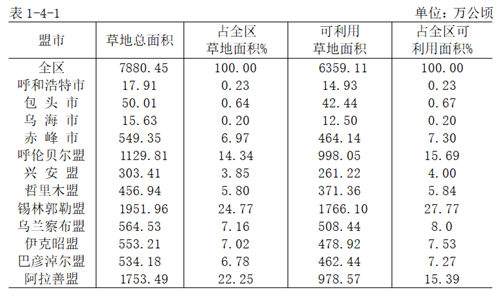 按行政区划划分,锡林郭勒盟草地面积最大,为1952万公顷,占草地总面积的24.8%;其次是阿拉善盟,草地面积1753.5万公顷,占草地总面积的22.3%;呼伦贝尔盟(今呼伦贝尔市)居第三位,草地面积1129.8万公顷,占草地总面积的14.3%。