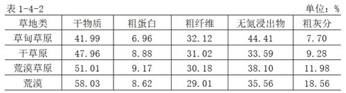 内蒙古天然草地的营养类型,草甸草原为碳—氮型;干草原以富含氮型为主,碳型明显下降:荒漠草原除以氮型为主外,灰分也起很大作用;荒漠灰分处于主导地位,为灰分—氮型。