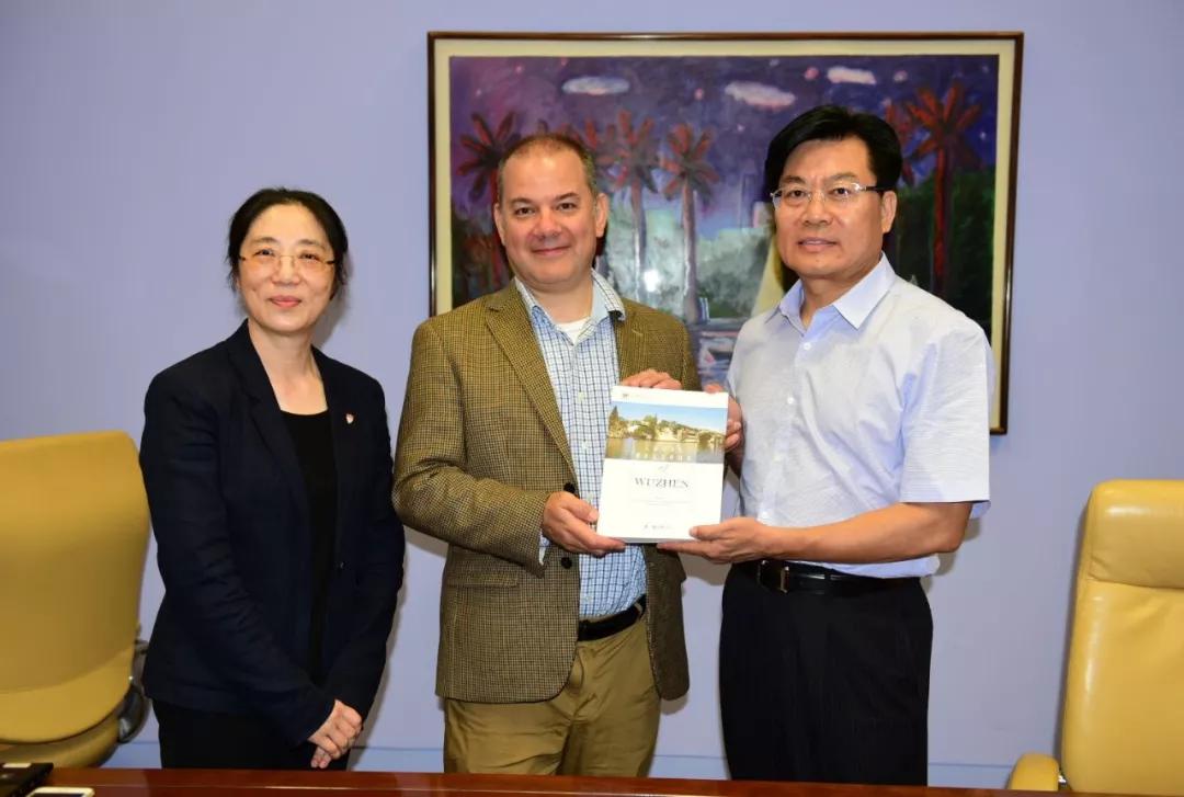 座谈前,冀祥德代表中指办向加州大学洛杉矶分校图书馆副馆长Todd Grappone赠送了“志书精品走出去”项目的先期成果《乌镇志》《周庄镇志》《枫泾镇志》英文版。