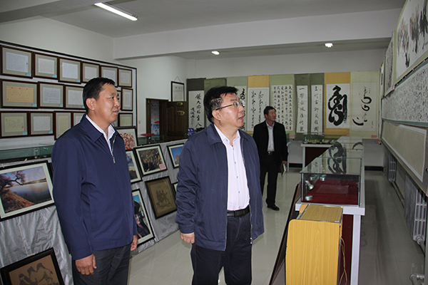 吴天军先后参观了阿盟档案史志局 1 号楼中的档案库、资料库、书画实物展厅、本土作家作品展厅、筹备中的阿拉善盟情展厅和 2 号楼中的党史馆、方志馆和部分办公场室。