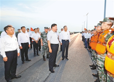 大堤上,习近平亲切看望慰问了在防汛抗洪救灾斗争中牺牲同志的家属、防汛抗洪一线人员、先进典型代表和参加抗洪抢险的部队官兵,并向全国奋战在防汛抗洪救灾一线的同志们表示诚挚的问候。他强调,今年入汛以来,南北方江河湖泊接连出现超警戒水位险情。广大干部群众和人民解放军、武警官兵坚决响应党和政府号召,发扬不怕累苦、不怕疲劳、不怕牺牲的精神斗志,坚守在防汛抗洪救灾第一线,涌现了许多先进典型和感人事迹,展现了中国人民众志成城、顽强拼搏、敢于胜利的英雄气概,书写了洪水无情人有情的人间大爱。党和人民感谢你们!