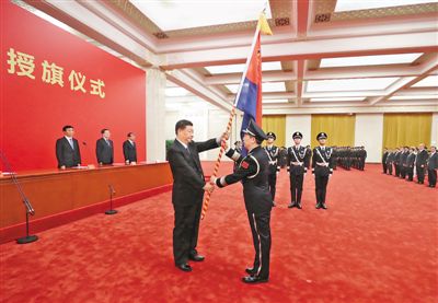 八月二十六日,中国人民警察警旗授旗仪式在人民大会堂举行。中共中央总书记、国家主席、中央军委主席习近平向中国人民警察队伍授旗并致训词。这是习近平向中国人民警察队伍授旗。