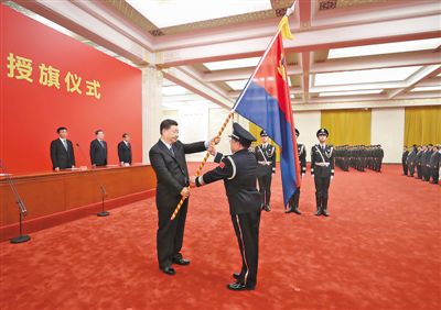 参加授旗仪式的人民警察进行了集体宣誓,誓词为:对党忠诚,服务人民,执法公正,纪律严明;坚定纯洁,让党放心,甘于奉献,能拼善赢。
