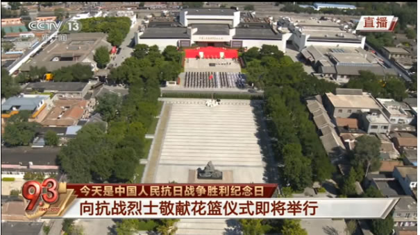 中共中央、全国人大常委会委员会、国务院、全国政协、中央军委和抗战老战士老同志、首都各界群众分别敬献的7个花篮一字排开,摆放在纪念馆前平台上。花篮的红色缎带上写着“在中国人民抗日战争中英勇牺牲的烈士们永垂不朽”。