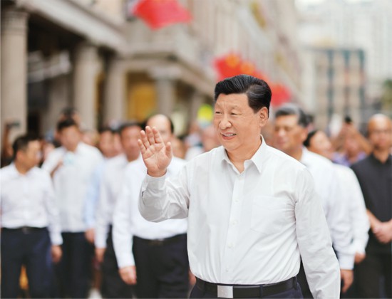 2020年10月12日至13日,中共中央总书记、国家主席、中央军委主席习近平在广东考察。这是13日下午,习近平在汕头市小公园开埠区步行察看街区风貌时,向当地群众和游客挥手致意。 新华社记者 王晔/摄