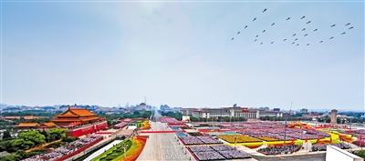 雄鹰翱翔,振翅长空。7时55分许,中国人民解放军71架战机飞向天安门广场,向党致敬,向中华人民共和国致敬,向人民致敬。空中护旗梯队拉开飞行庆祝表演序幕,5架直升机分别悬挂中国共产党党旗和写有“伟大的中国共产党万岁”“伟大的中国人民万岁”“伟大的中华人民共和国万岁”“全国各族人民大团结万岁”的条幅迎风向前。随后,直升机、战斗机分别组成“100”“71”字样掠过长空,15架歼—20飞机组成3个梯队呼啸而过,教练机拉出10道彩烟,精彩的表演激起一阵阵欢呼声。