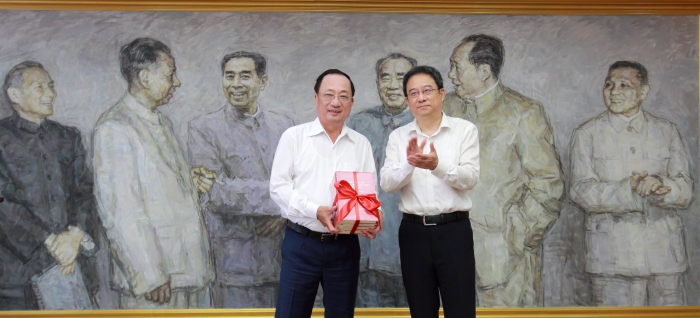 双方在“老一辈革命家”油画前合影留念。