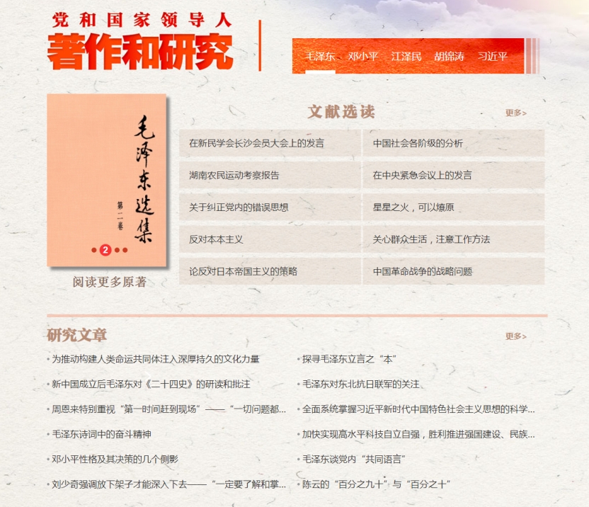 “党和国家领导人著作和研究”栏目收入《毛泽东选集》《邓小平文选》《江泽民文选》《胡锦涛文选》《习近平著作选读》等著作中的重要讲话、报告和文章以及相关研究成果。