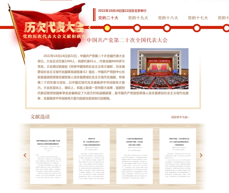 “党的历次代表大会文献和研究”栏目系统汇集自党的一大至党的二十大历次党的全国代表大会和中央全会等重要文献以及相关研究成果。
