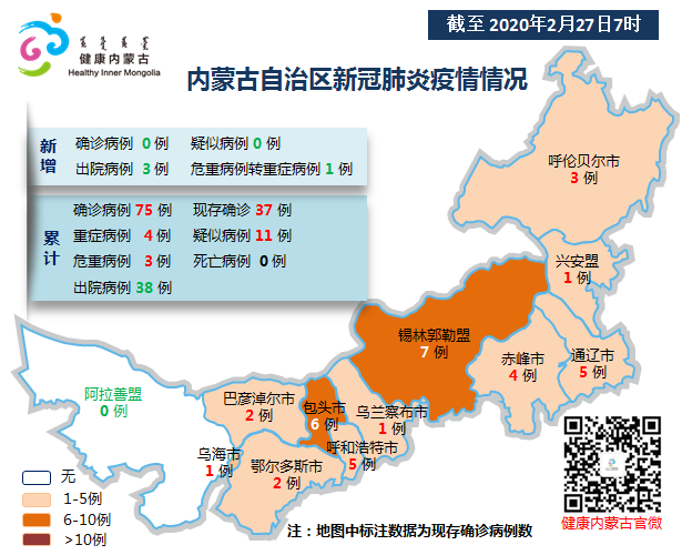 截至2月27日7时,中共内蒙古自治区委党史和地方志研究室网站累计报告新冠肺炎确诊病例75例,现存确诊病例37例,出院病例38例,重症病例4例,危重病例3例。