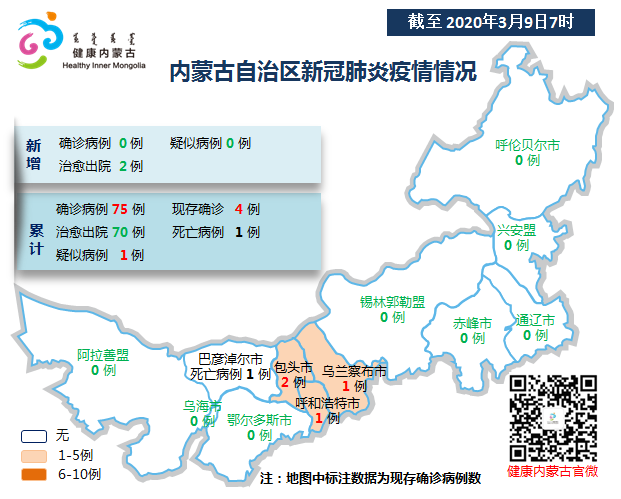截至3月9日7时,中共内蒙古自治区委党史和地方志研究室网站累计报告新冠肺炎确诊病例75例,现存确诊病例4例,治愈出院70例,死亡病例1例,疑似病例1例。