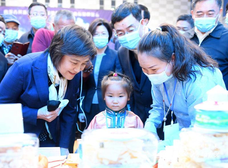 10月17日,自治区党委副书记、自治区主席布小林,在全区推进奶业振兴暨民族传统奶制品产业发展现场会上参观各盟市民族传统奶制品产品展示。内蒙古日报社融媒体记者 韩卿立 摄
