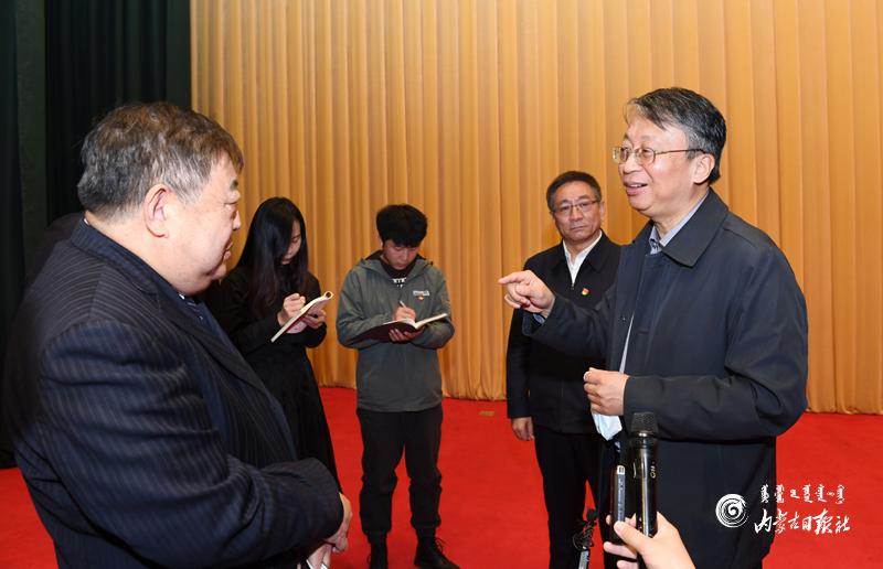 11月8日上午,在学习贯彻党的十九届五中全会精神中央宣讲团内蒙古报告会结束后,聆听报告会的部分人员与宣讲人沈春耀互动交流。内蒙古日报社融媒体记者 袁永红 摄