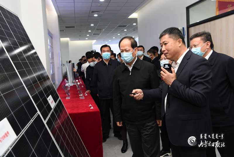 4月21日,自治区党委书记、人大常委会主任石泰峰,与参加自治区推动高质量发展重大项目建设动员大会的代表一起观摩弘元新材料(包头)有限公司单晶、切片项目产品。内蒙古日报社融媒体记者 袁永红 摄