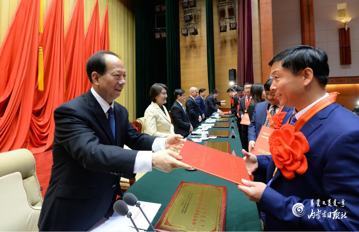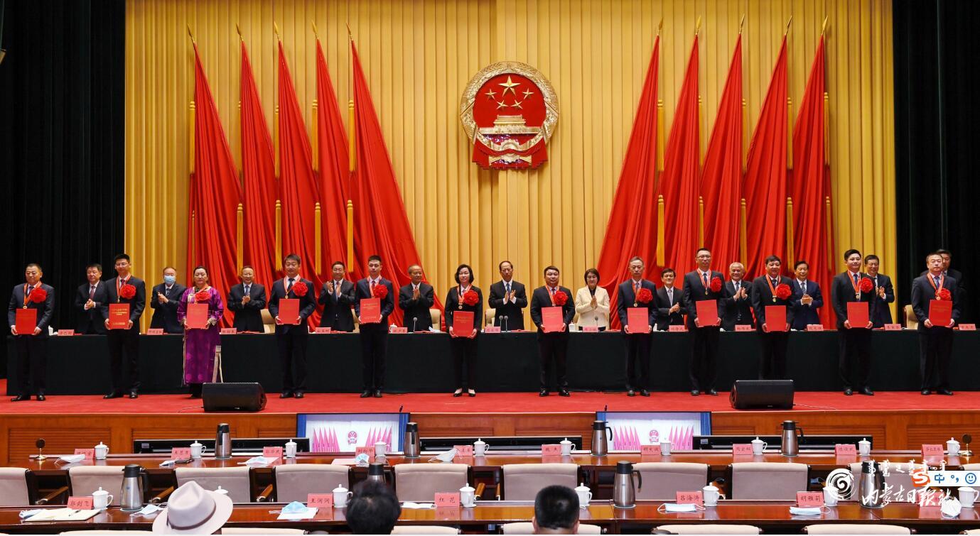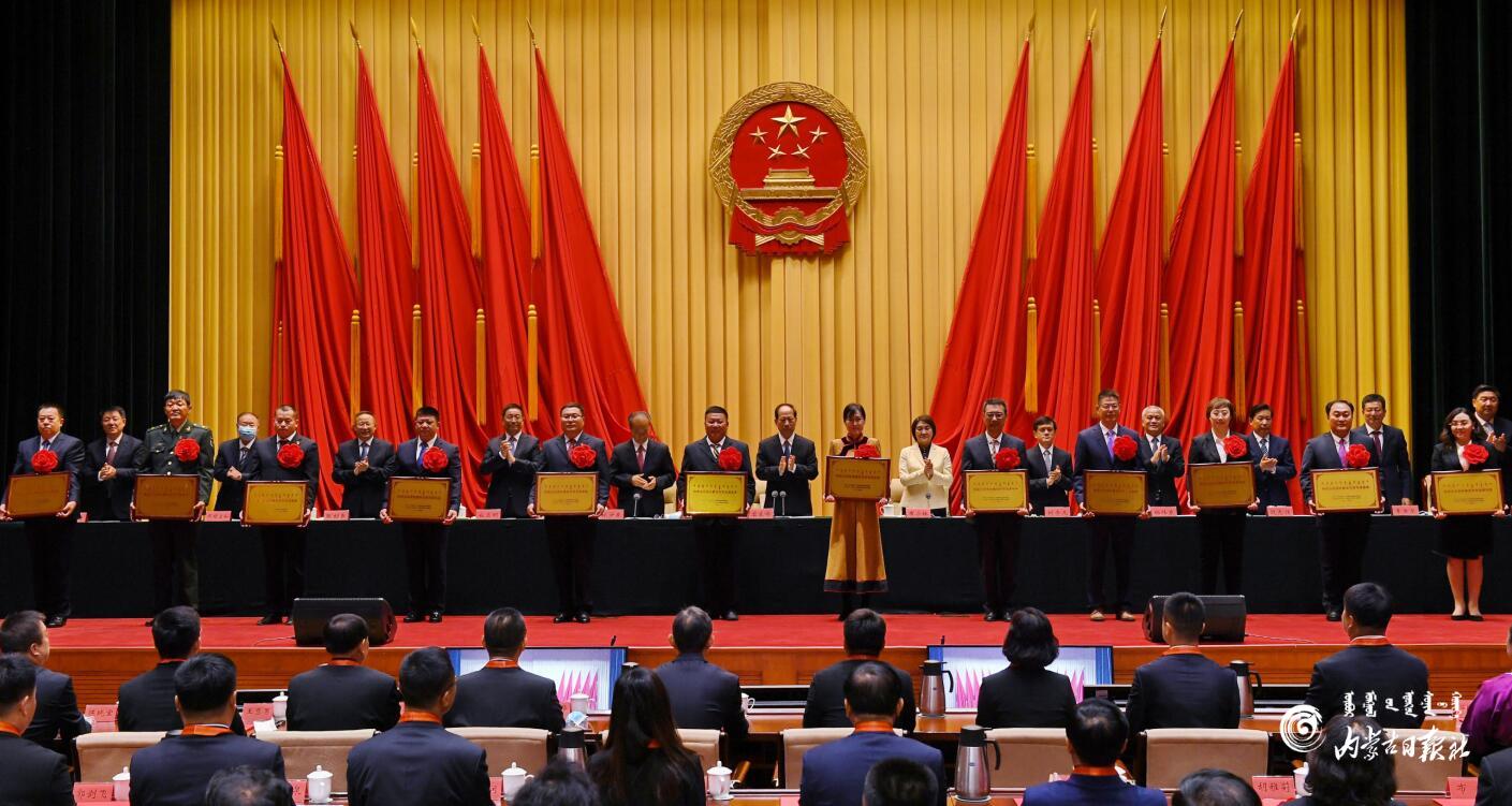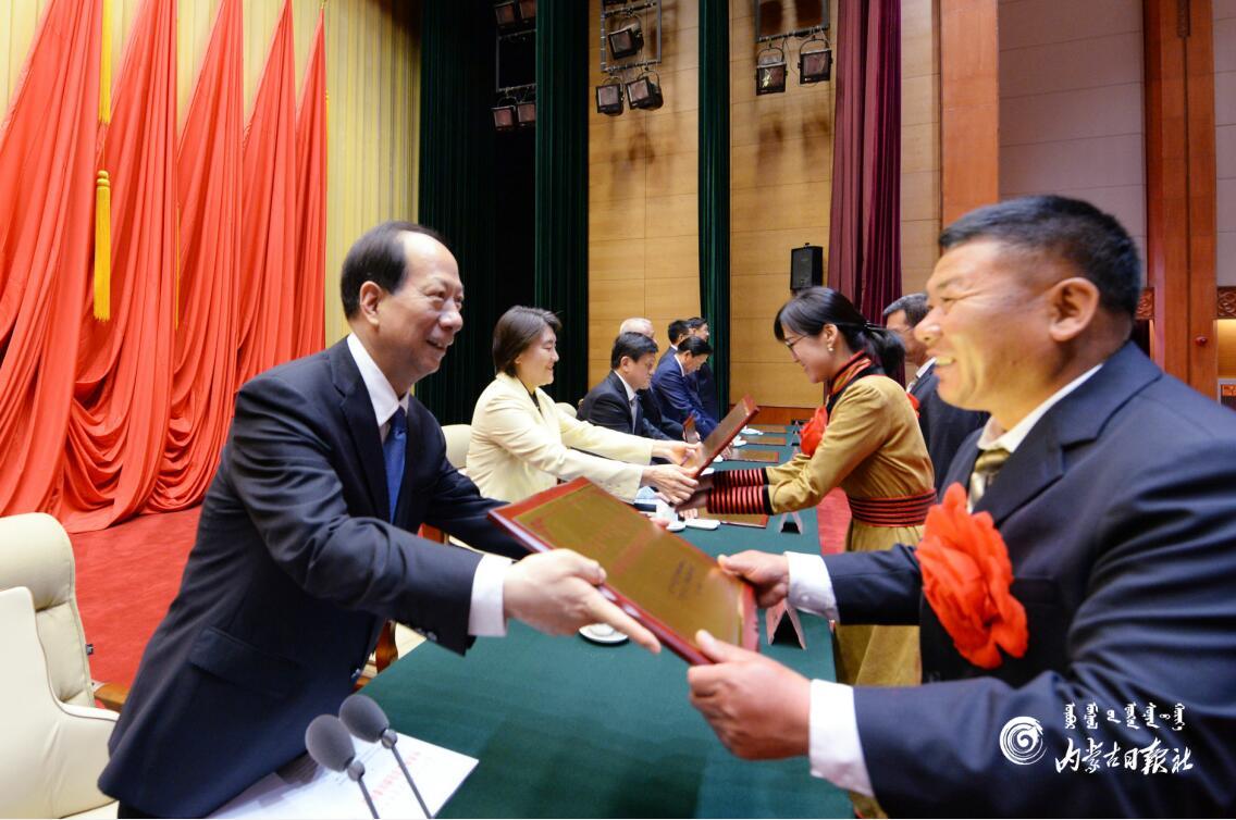 6月22日上午,出席大会的自治区领导为受表彰的先进个人代表颁发奖章和证书。内蒙古日报社融媒体记者 王磊 摄