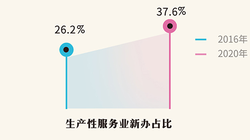 生产性服务业新办最活跃,当年新办涉税市场主体数量占全行业的比例,从2016年的26.2%,提高到2020年的37.6%。而对技术要求较低的生活性服务业,新办占比则下降了12.9%。