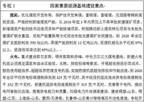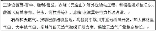 建设国家重要能源基地。适应能源“消费、供给、技术、体制”革命新形势,加快转变能源工业发展方式。在减量置换前提下,采取与煤炭转化项目联合重组、市场化配置煤炭资源等方式,保障重大能源战略项目和重大煤化工项目用煤。抓住国家电源布局向煤炭基地转移等有利时机,加快电力外送通道及配套火电装机规划建设,支持大型坑口燃煤电站建设,合理布局热电联产项目,到2020年全区火电装机容量达到1亿千瓦。稳定石油产量,扩大天然气产量,推进煤层气开发利用。到2020年,能源产业产值达到9000亿元,建成国家重要能源基地。
