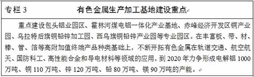 建设有色金属生产加工基地。开展“找矿行动”,实施有色金属矿产资源整装勘查开发,提高矿产资源保障能力。推动“煤电冶加”、“探采选冶加”一体化循环发展。加快高铝粉煤灰提取氧化铝技术攻关,降低生产成本,推动示范技术产业化应用。提高有色金属延伸加工能力,丰富有色金属产品种类。到2020年,有色金属生产加工产业产值达到4900亿元,培育形成有色金属循环产业链、产业集群和集聚区,基本建成我国重要的有色金属生产加工基地。
