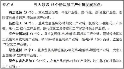 建设新型化工基地。以煤化工、氯碱化工、硅化工和氟化工、精细化工为重点,推动新型化工产业一体化、集群化、循环化、安全化发展。瞄准国际新技术、新工艺,高起点开发引进国内外新型化工先进技术和装备,争取在节水、节能和生产工艺等方面取得重大技术突破。加快新型化工产业纵向延伸,提高资源就地加工转化增值水平,推动传统化工产业向精细化工产业延伸发展。加快煤化工、氯碱化工、硅化工和氟化工、精细化工产业耦合发展,推动新型化工与装备制造、轻工、纺织、建材、新材料等产业融合发展,进一步丰富终端产品品种。到2020年,新型化工下游延伸加工产品品种达到100个以上,新型化工产业产值达到5100亿元,建成世界领先的国家级新型化工基地。