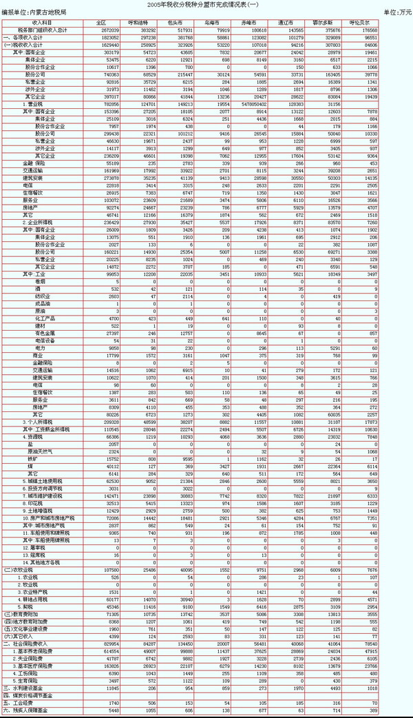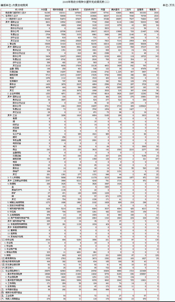 【税收特点】 一是税收收入增幅创地税成立以来同期最好水平,在全国地税系统排名第二位,在西部省区排名第一位,比全国地税平均水平高出25.4个百分点,高出西部省区地税平均增幅22.9个百分点。二是全区地税系统是在涉农税收停征,各项优惠政策减免造成减收11.4亿元的情况下实现的高幅增长,收入结构更加合理,收入进度更趋均衡,收入质量明显提高。三是第二、三产业地方税收贡献率显着提高。第二产业累计完成税收收入77亿元,增长47%,第三产业累计完成税收收入85亿元,增长41%。四是地方主要税种增幅较大。营业税、个人所得税、企业所得税和资源税增长较快,是拉动全区税收总收入快速增长的主要因素,四个税种累计增收42.61亿元,占税收总收入增收额的85.33%。五是全区各地普遍增收。有8个盟市税收总收入的增幅在40%以上,其中,鄂尔多斯市增量和增幅最高,同比增加13.82亿元,增长96.05%。鄂尔多斯市、锡林郭勒盟、满洲里市、乌海市、巴彦淖尔市、区局直属征收局、阿盟、包头市等8个盟市税收总收入均提前完成年度计划任务。
