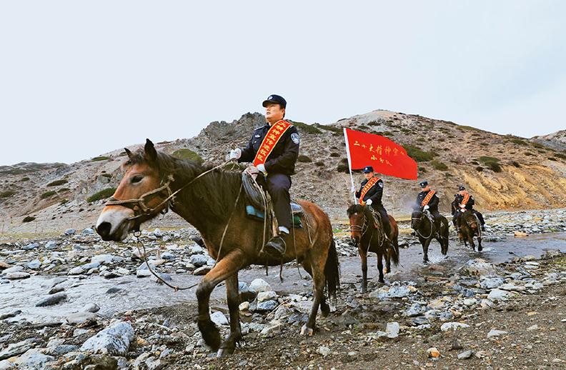 在新疆维吾尔自治区阿勒泰地区,哈巴河边境管理大队成立“二十大精神宣传小分队”。图为2022年10月27日,小分队民警骑马深入辖区与牧民共同学习党的二十大精神。 人民视觉 王友波/摄